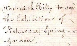 Richard bought this engraving showing ‘the back front of the New Royal Academy’ when he visited it in 1780. The building opened twelve years before and by 1781 some 547 paintings were displayed. By 1801 the number had almost doubled, and in accordance with the taste of the day, paintings were displayed closely together, from floor to ceiling. Further information on the Royal Academy appears here.• Pictures at Spring Gardens (otherwise known as Vauxhall Gardens)