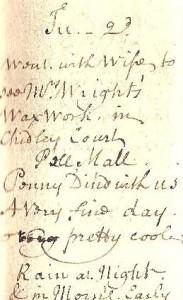 The British Museum opened in 1759 and Richard went to see it the following year. Visitor numbers were strictly controlled – you bought a ticket some days in advance and were given a fixed time and date to call. Visitors were accompanied by a guide, taken round in groups of a dozen. More details about the British Museum appears at the link here.The original museum was housed in Montagu House, pulled down in the 1840’s. Entry was free and given to ‘all studious and curious Persons’ and included the chance to see the vast collection of natural curiosities (shells, fossils, insects, and natural phenomena) built up by Sir Hans Sloane, as well as the magnificent bequest from George II of the old Royal Library.