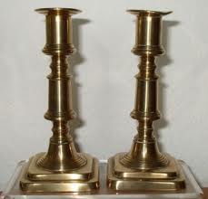 A pair of Princes metal candlesticks. 1 pr shorter Ditto.3 high brass Ditto. A brass ladle. A tin fish kettle plate & cover. 5 Saucepans & covers. 6 candlesticks. 10 patties. Loose tea ware (?). Bread basket.