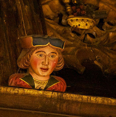 Historian Neville Williams claimed that masons worked round the clock for five years to complete the rebuilding of the hall to Henry's showy satisfaction. The room would have been overpowering to the senses, the tastes and smells of rich foods and spices, the feel of lush wood paneling and tightly woven tapestries, the music of players, the courtly flirtations. But high above the heads of the guests, tucked into the dark corners of the roof beams, lurked some of the Great Hall's most interesting features of all. Fine embellishments had been carved into the ceiling beams, among them an HA crest for Henry and Anne Boleyn which remains to this day, but especially intriguing are the Eavesdroppers, carved into the ceiling beams and other places as well.