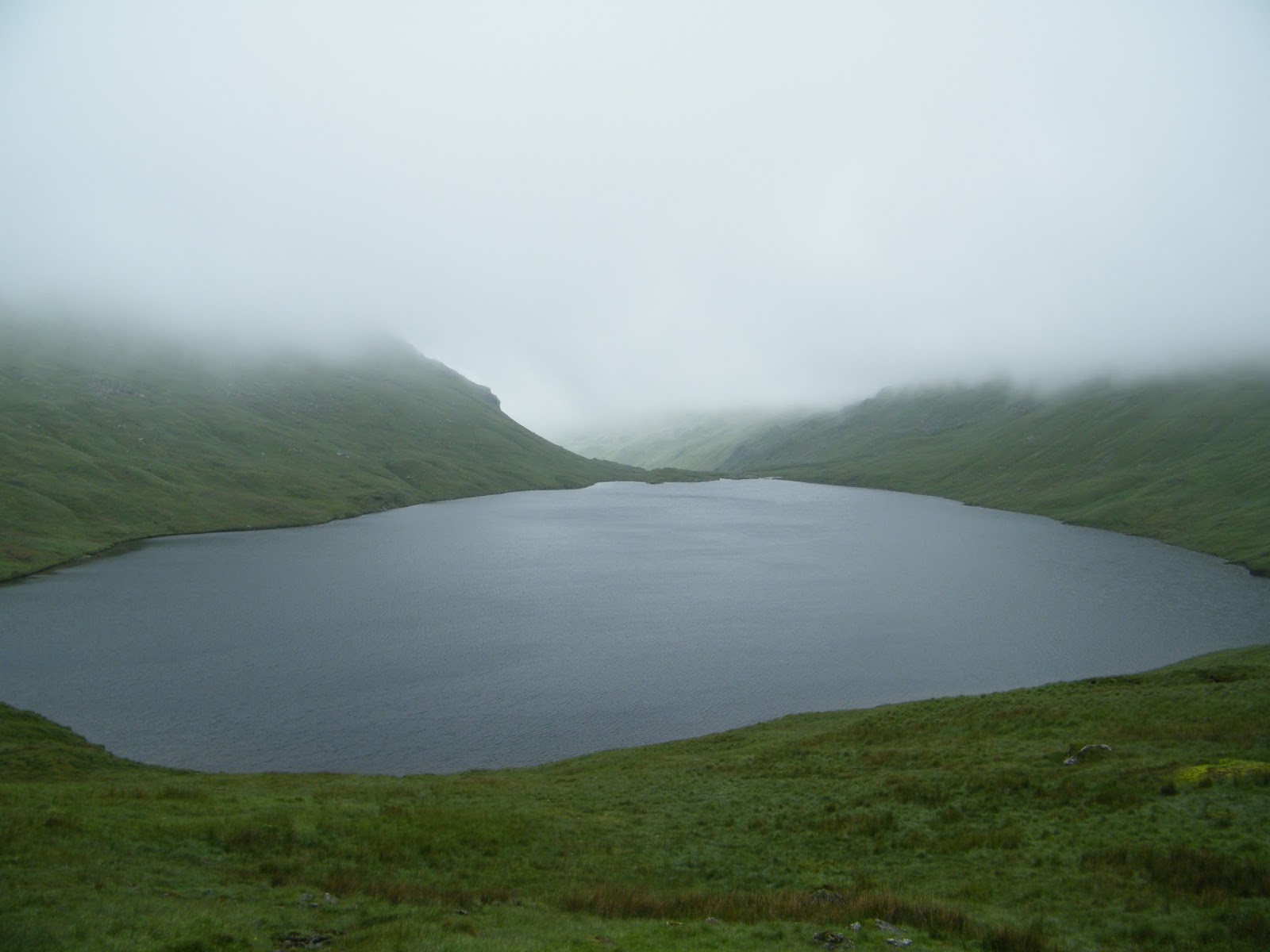 Then it was on to the famous Dunmail Raise. That cairn looks suspiciously modern, to me, but never mind. I decided to test out another bit of the legend, which is that two of the slain Dunmail’s warriors carried his crown to Grisedale Tarn and threw it in the water, running to escape the approaching army. Hmm. Have you tried running up to Grisedale Tarn? (Admittedly, I’m no fell runner, nor am I a seasoned medieval warrior!) I will say that the capricious Cumbrian weather provided me with a mystical moment; it was a misty, mizzly morning and by the time I’d climbed up to where the landscape flattens out a little, I could only see about 20ft ahead. I’d no idea how close I was to the water, until the clag suddenly lifted and the tarn appeared, right in front of me. Unfortunately, though there was a sudden beam of sunlight, no hand rose out of the water brandishing Dunmail’s crown.