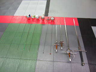 (right to left) Medieval Longsword; Rapier; two Smallswords; Classical Epee, Foil, and Radellian Sabre; modern Epee, Foil, and Sabre