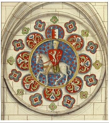 Chartres window – this image has roused a great deal of confusion regarding the arms of Simon the Earl of Leicester, whose blazon, as depicted by his friend Matthew Paris in his Chronica Majora, shows a two tailed RED lion rampant on a White ground – suitably differenced from his father white-lion-on-red arms as a younger son’s would be.