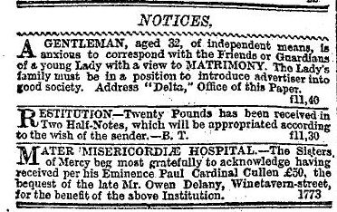 For more about the Matrimonial advertisements, visit my blog post, (pr)eHarmony - or Alternative Courtship in the Victorian era.*personal ads taken from 1)Freeman's Journal and Daily Commercial Advertiser. Dublin, Ireland. 12 Feb 1875 2)Truman's Exeter Flying Post. Exeter, England. 30 Sep 1893 3)Bristol Mercury and Daily Post. Bristol, England. 19 Mar 1892